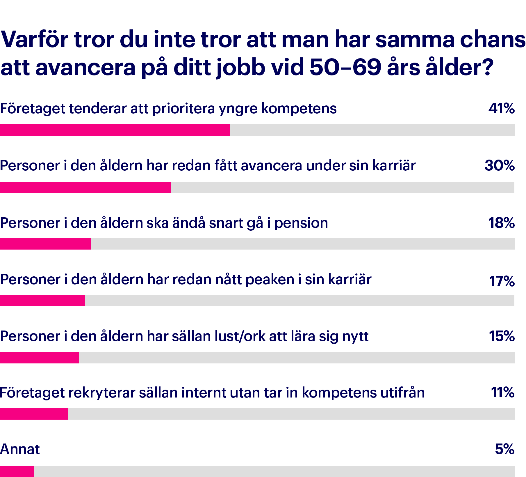 Flest personer i Sverige (40%) tror att man har störst chans att avancera på sitt nuvarande jobb (det vill säga få en högre befattning alternativt möjlighet att byta roll eller tjänst internt) vid 30–39 års ålder. Endast 3 procent tror att det är i åldern 50–69. På frågan varför så svarar flest (41%) att det beror på företagens prioritering av yngre kompetens.