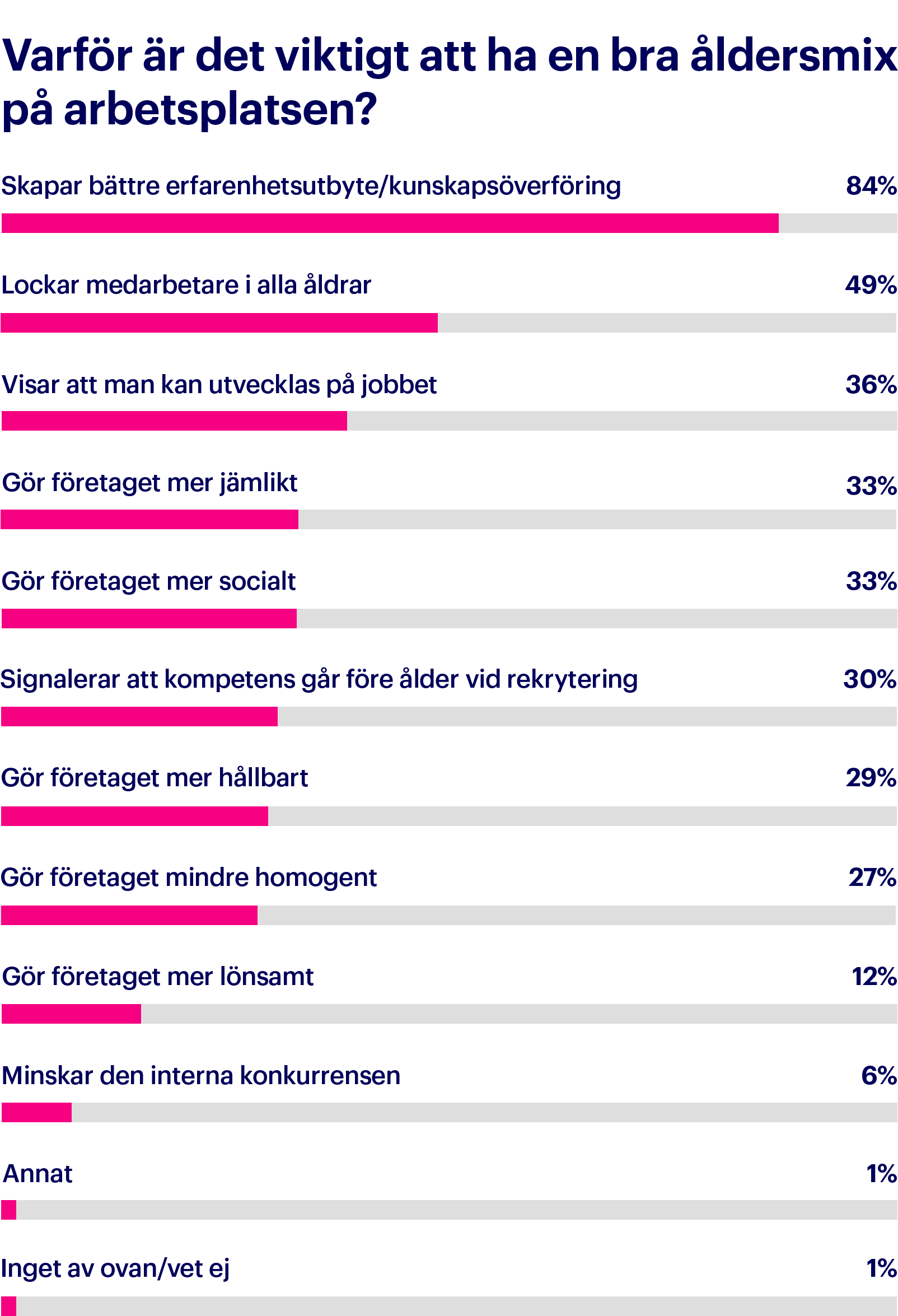 Näst flest (49%) menar att det är bra för att det lockar anställda i alla åldrar och 36 procent tycker att åldersmixen visar att man kan utvecklas på jobbet.