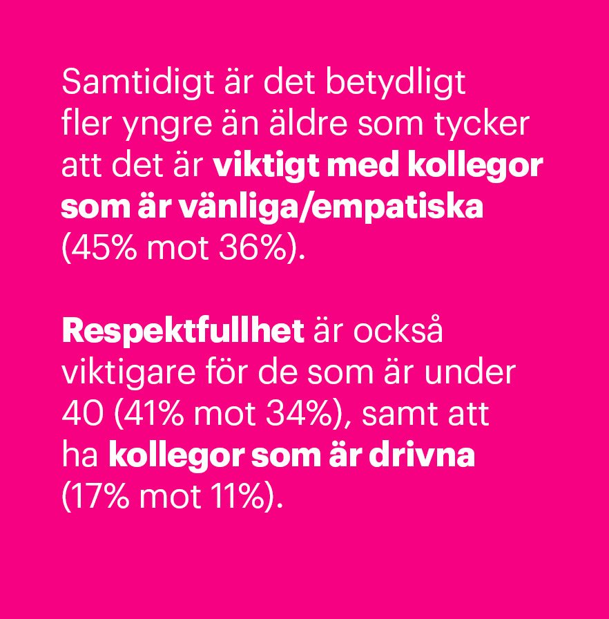 Vad värdesätter vi hos våra kollegor och vilken åldersgrupp är bäst på att leva upp till det som önskas? Hur jämn är fördelningen vad gäller anställda i olika åldrar – och hur viktigt är det för Sveriges arbetstagare att ha en bra åldersmix på jobbet?